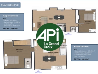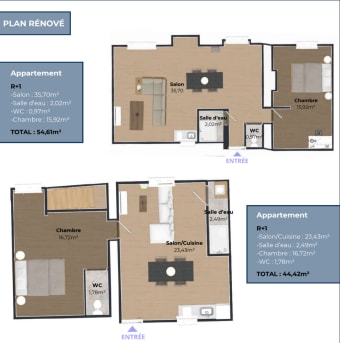- Au R+1 vous aurez la possibilité de créer soit 1 lot de 100m² de type T3/T4 ou deux lots de type T2 de 55m² et 44m²